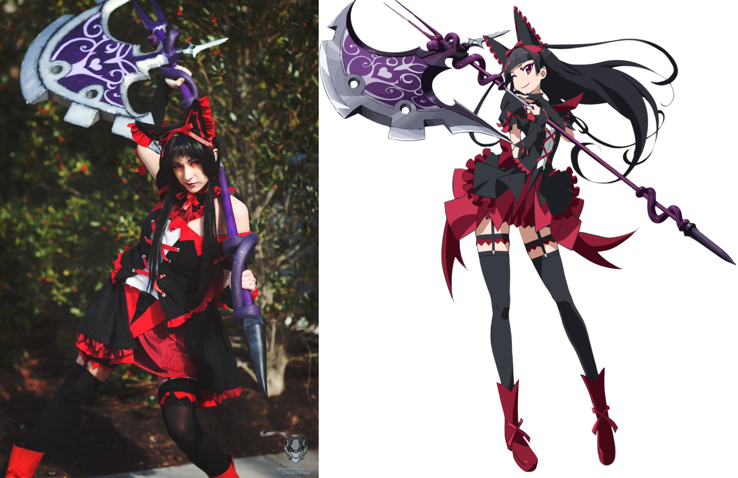 Costume Creation: The fabric for the shirt, skirt, and gloves were a thick black velvet fabric and the red was a basic 2 way stretch polyester knit fabric. I sewed horsehair into the skirt to give it the extra fluff and curl along the inside for the added lolita look. The headband had wiring in the easrs and the red design on them was embroidered on. The ruffles throughout the cosplay were done with a ruffle foot.